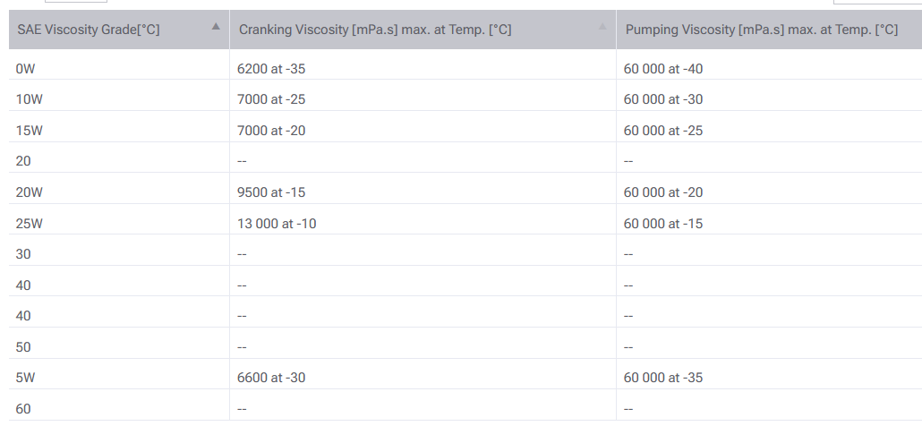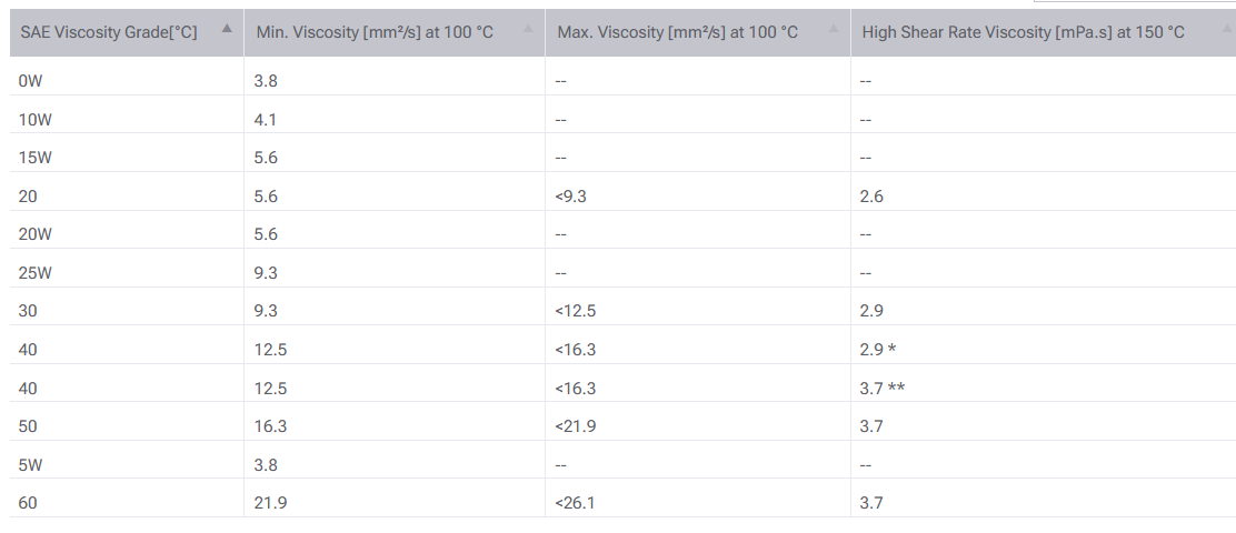 Standard SAE pro vysokoteplotní viskozitu vypadá následnovně: Rozptyl viskozity pro standardizovaných 100°C je u SAE50 cca o třetinu vyšší než u SAE40.