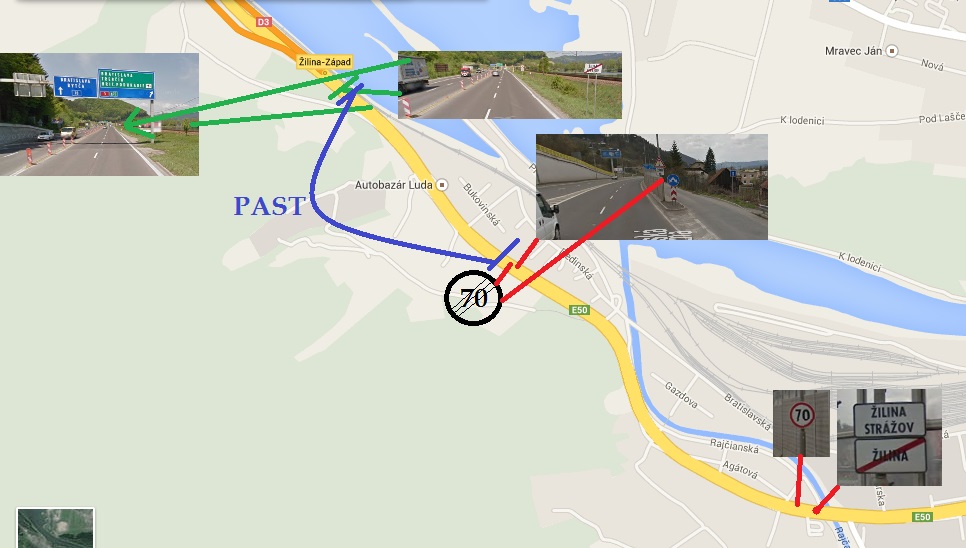 Na výjezdu ze Žiliny je na pravo Slovnaft, přejet most a pak za sebou tři značky "konec Žilina", "začátek Žilina - Strážov" a značka "omezení rychlosti 70". A od tama se jelo 2km až na konec Žiliny. Teď je nově u odbočky na restauraci Marakana "konec 70". Takže posledních 500m před "konec Žilina - Strážov" je zase obec a 50km/h, ale protože je to novinka, tak čekám časté vybírání. Před koncem města je rovinka a tam stávaj fízlové, protože to hodně lidí rozjíždí. Teď s novým snížením rychlosti tam budou stát ještě více.