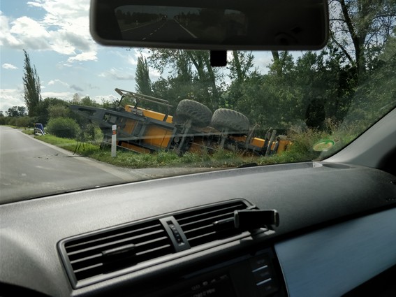 pokud to vysypal na naprosto rovnem useku silnice prvni tridy, tak to vsechna cest, ale ja spis tipuju, ze vyjizdel z te vedlejsi polnacky, jejiz cast jde videt vpravo dole a jednoduse si nenajel, jak mel... Bud, jak bud, cest jeho praci