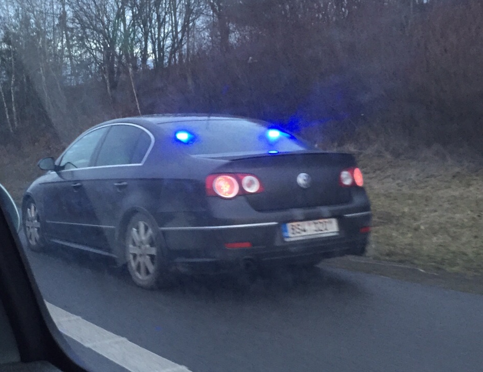 Hlásit se to musí: velmi aktivní PČR v Passatu R32, RZ 3P0-1652, měří v posledních dnech v centru Plzně. Barva je podle seznamu zde černá, ale podle mě tmavě mordá