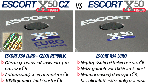 "U detektoru Escort X50 Euro hledejte na detektoru logo "EURO - CZECH REPUBLIC..."