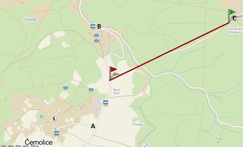 Policajti jeli od Černolic bod A, dojeli jsme se současně dole na křižovatce bod B, já jel z bodu C
