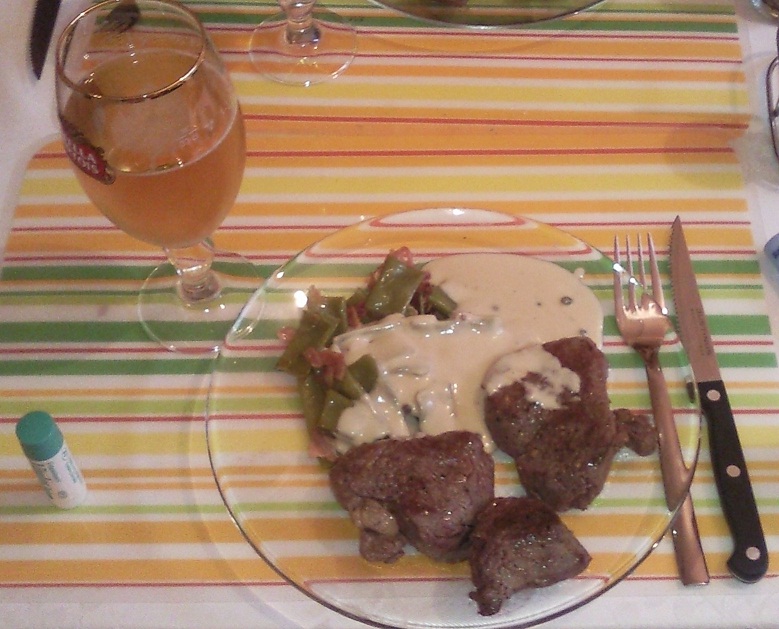 Hovězí svíčková, na omáčce se zeleného pepře s fazolovýma luskama se slaninou :x