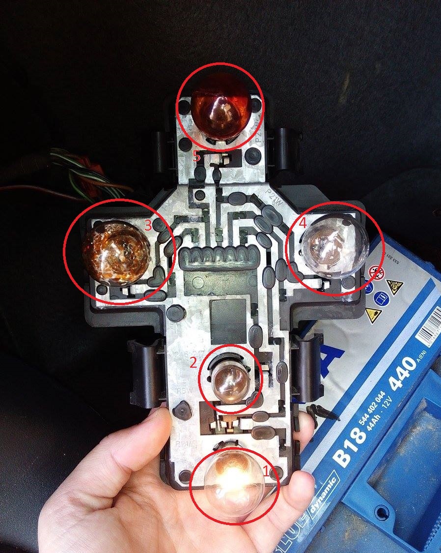 Dobrý den, mám felicii 1.3 MPI r.v. 1997 a chtěl bych se zeptat k čemu jsou jaké žárovky na zadním světle viz foto (levá strana). Vím jenom, že 1 je klasické světlo + brzdové a 3 je blinkr a chtěl bych se zeptat, k čemu je 2, 4 a 5. Údajně mi nesvítí mlhovka a chtěl bych to zkusit proměřit.