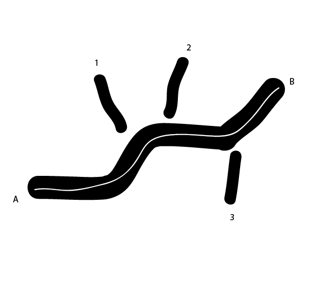 Ale vždyť tak to není. Dvě vozidla na hlavní jsou pořád protijedoucí - z druhé strany hlavní jedoucí vozidlo je pro mě protisměr. Viz obrázek. Když přeci pojedu z bodu A do bodu B, sice v určité chvíli bude vedlejší silnice č.2 přímo "proti" mně. Není pro mě však ale protijedoucí, ne? Protijedoucím pro mě zůstává po celou délku křižovatky vozidlo jedoucí po hlavní z bodu B a kdykoliv na dráze ho budu křižovat (odbočovat z hlavní doleva), musím dávat podle tohoto ustanovení přednost.