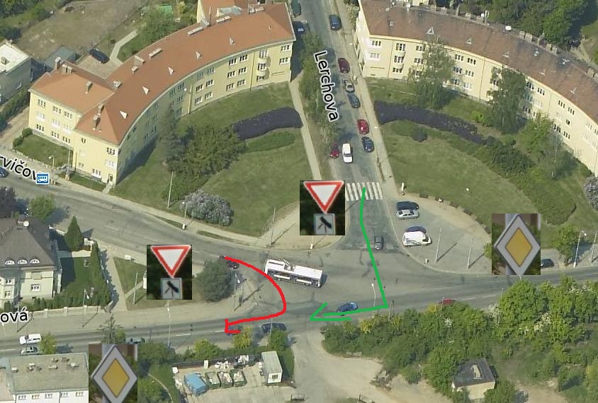 Kdo má přednost tady? Podle mě zelený, jelikož najede na hlavní silnici před červeným, ale jistý si nejsem, a podle všeho si nebyl skoro nikdo. Dnes je ulice Lerchova (zelená šipka) jednosměrka, ale nebývalo to tak