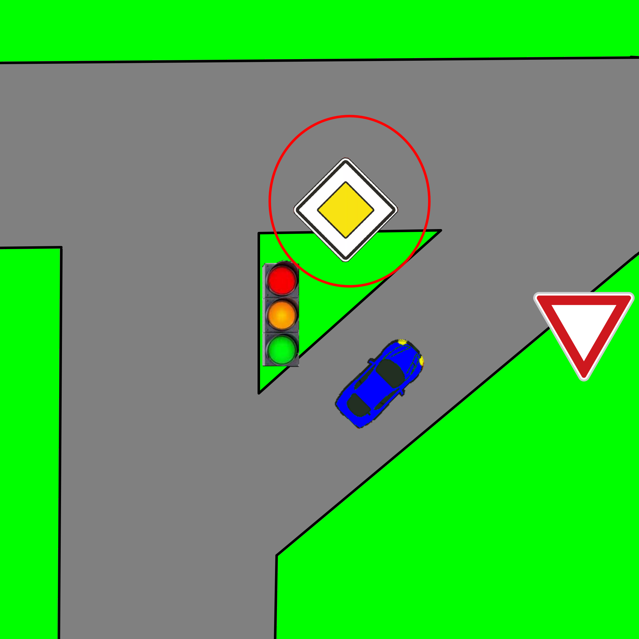 Střešovická x Patočkova, jedeme stejně jako na view Fiat Stilo. Dle zákona by ale mělo auto odbočující doprava zastavit, protože má lidově "červenou". Běžná praxe: všichni dají přednost autům jedoucím po Patočkově a normálně se zařadí. Nepamatuju na jediný případ, kdy by někdo odbočující doprava stál na červenou.