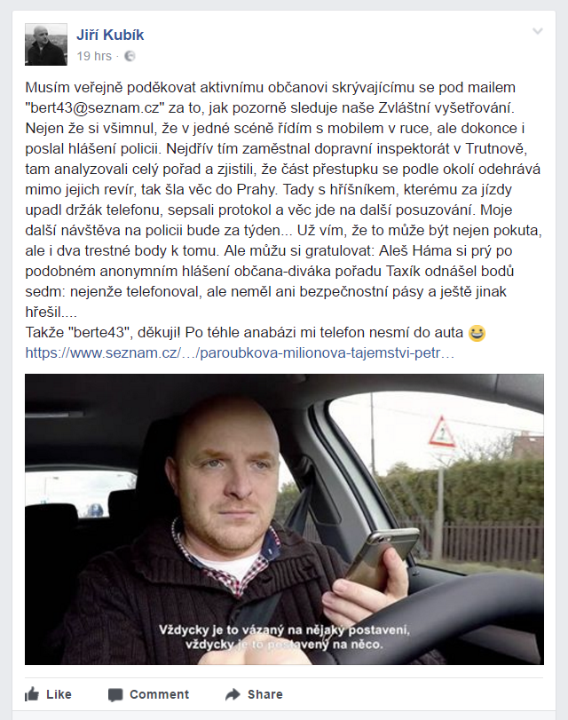 Pamatujete na to video Superb vs. polská dodávka? Nějaký iniciativní ovčan podal podnět na Dálniční oddělení Kocourovec, tak jsme si s panem policistou, co to bohužel dostal na starosti, několikrát volali. Ve zkratce (mám to nahrané) první telefonát proběhl tak, že jsem mu sdělil, že jsem video nalezl a zveřejnil. Druhý telefonát proběhl tak, že mi řekl, že si myslí, že jsem autorem podle komentářů pod videem, na to jsem mu řekl, že je to jeho názor, ale že do komentářů si můžu plkat co chci, pokud to není v rozporu se zákonem, každopádně že RZ neznám. Došli jsme k závěru, že pokud bude chtít vysvětlení na místním oddělení, využiju práva nevypovídat. Mezi řečí padla slova o tom, že si nemyslím, že s takovým časovým odstupem je produktivní něco řešit, obzvlášť v případě, kdy si to zřejmě účastníci vyřídili mezi sebou sami a že by bylo fajn napřít úsilí na postihování podobného jednání přímo v provozu. Podání vysvětlení jsem následně absolvoval a s místní slečnou policistkou jsme se celkem zasmáli.