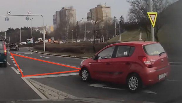 Nevím jak vy dva experti, ale já vidím, že červené vozidlo se pořád pohybovalo na vedlejší PK. Značení je naprosto v pořádku. Jedna přerušovaná pokračuje do pravého pruhu na hlavní PK a ta druhá na levý pruh, resp. prostřední. Auto s kamerou jede po hlavní PK, odbočuje vpravo. Při tomto manévru musí přejet nejdříve z části do vznikajícího pravého pruhu a poté z tohoto pruhu odbočit vpravo. Jelikož hlavní silnice, označená svislou značkou P2, platí pro vozidlo s kamerou a nejbližší křižovatku (což je právě křižovatka, kterou oba vozy projíždí), pro tu samou křižovatku platí pro červené vozidlo V4.