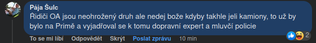 Co taková magistrála, Jižní spojka? Úplně běžný, že osobák vedle mě jede stejnou rychlostí, za ním kolona a on? Úplný nezájem. Točit se na tom že je to v obci a je blokace levýho pruhu OK, je dost plytký - prostě se tím zasírá provoz a je úplně irelevantní kde to je