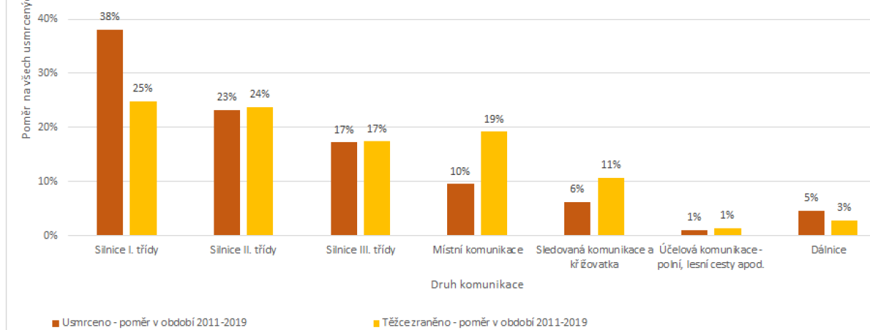 V období 2011-2019 bylo v obci usmrceno 31 % (průměrná roční změna -6 %) a mimo obec 69 % osob (průměrná roční změna -2 %), poměr těžce zraněných pak činil 53 % v obci (průměrná roční změna -5 %) vs. 47 % mimo obec (průměrná roční změna -4 %).
