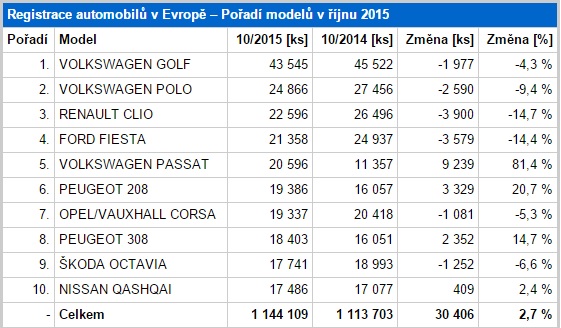 To by ale VW klesnul z dobré pozice na trhu...jelikož první dvě nejprodávanější auta jsou VW (1. Golf, 2. Polo, 5. Passat a 9. Octa)