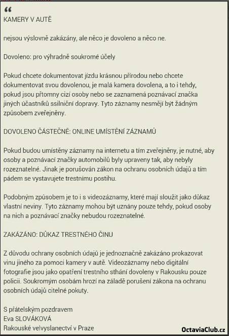 Co jsem pochopil, tak by jim nevadila kamera kvůli omezení výhledu, ale kvůli ochraně osobních dat (poznávací značky aut, gesichty...) ostatních účastníků provozu.