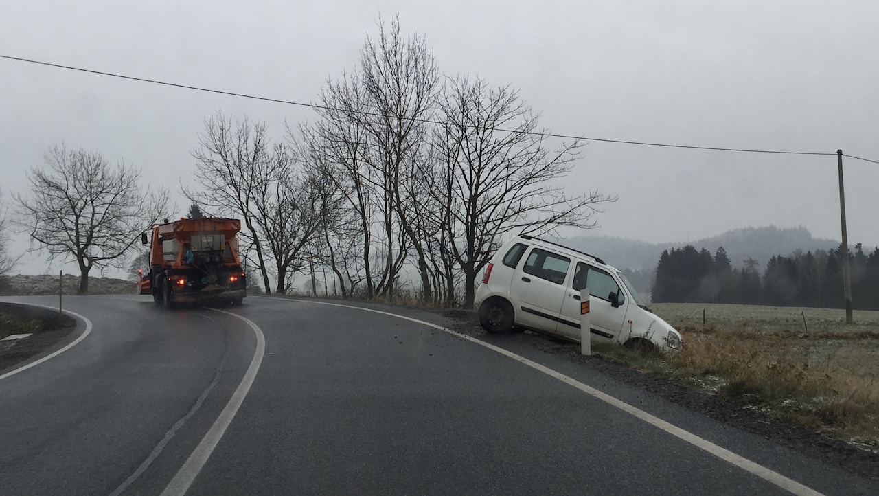 Dneska bylo trochu víc ledu na silnici... Na trase asi 13 km jsem takto napočítal asi 8 aut